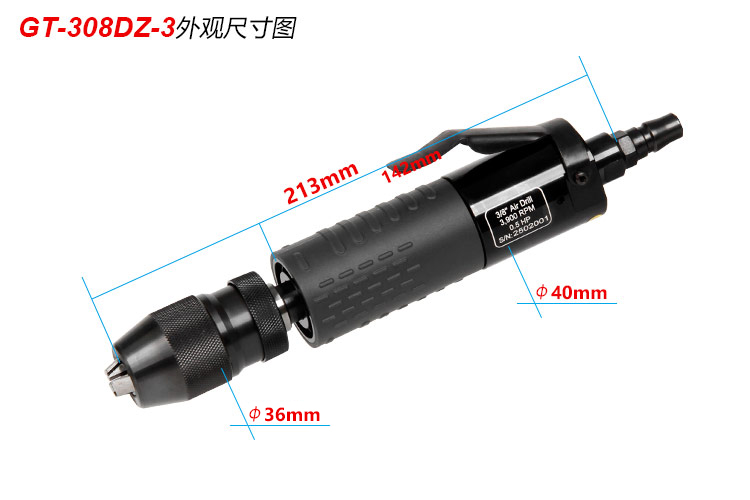• 產(chǎn)品參數(shù): 夾頭尺寸:3/8" 【1-10mm】 馬達(dá)功率:0.5HP 空載轉(zhuǎn)速:3900rpm 全 長:213mm 重 量:0.88kg 耗 氣 量:0.69m3/min 【工業(yè)型】