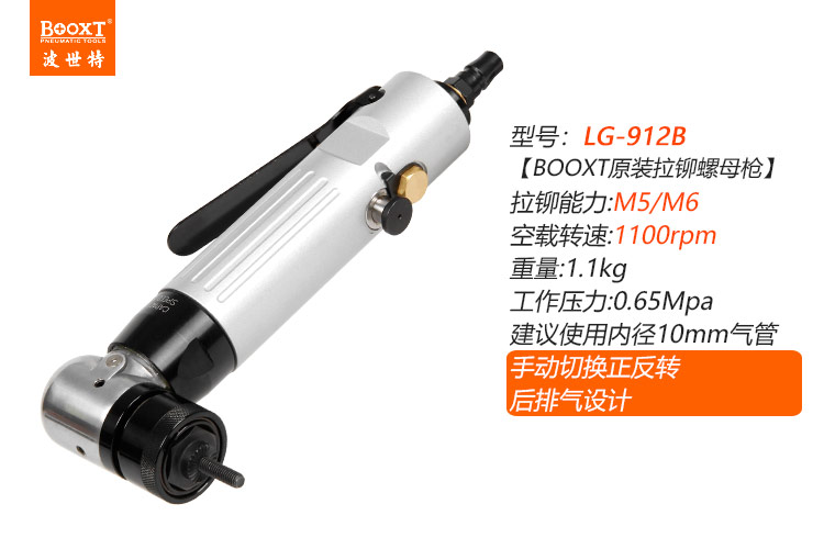 東莞市強勁五金工具有限公司提供臺灣BOOXT波世特品牌氣動工具,彎頭氣動鉚螺母槍LG-912B廠家直銷,首件享特價。咨詢熱線:4008301980