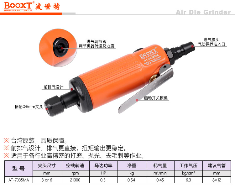 東莞市強勁五金工具有限公司提供臺灣BOOXT波世特品牌氣動工具,前排氣風磨機AT-7035MA廠家直銷,首件享特價。咨詢熱線:4008301980