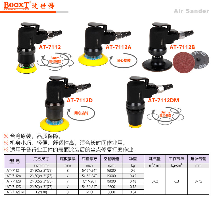 東莞強勁五金工具有限公司提供臺灣BOOXT波世特氣動工具,迷你氣動偏心打磨機AT-7112廠家直銷,首件享特價。咨詢熱線:4008301980